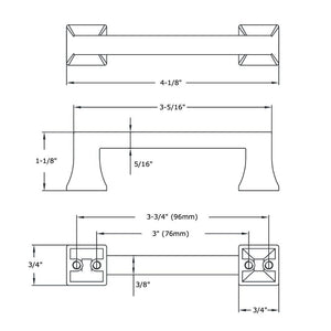 The Cosmas 10556FB cabinet pull is solid metal pull with a flat black finish. Perfect for places that need different hole spacing, the underside of the pull has two hole options; one for 3 inch hole centers, and another for 3-3/4 inch hole centers. The uncomplicated design of the pull features a solid rectangular bar which flanges out to square posts, giving the handle a more substantial appearance. Overall, the pull is weighty with square corners that are smooth to the touch and due to the solid smooth back, also extremely comfortable to grasp.