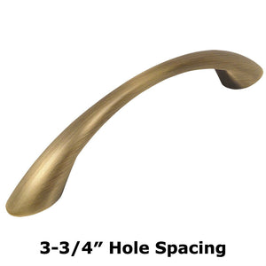 The Cosmas 4003BAB cabinet pull features an arched profile that offers a comfortable grip and a more softened look on doors and drawers. With 3-3/4 in. (96 mm) center-to-center spacing, 5-1/4 in. overall length, and 1-1/8 in. projection, it offers balanced proportions for kitchen cabinets, bathroom vanities, furniture, and built-ins. Its die-cast zinc construction provides lasting everyday durability. The Antique Brass finish adds warmth and character, making it an easy way to introduce a richer accent to cabinets and furniture.